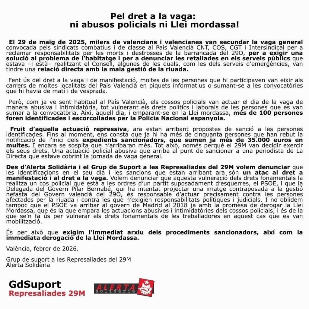Ara, mesos més tard, des de la Delegació de Govern al País Valencià arriben multes emparades sota la Llei mordassa. Aquesta, que dona més marge per als abusos policials i imposa condemnes més greus contra les persones a les quals s’aplica, encara no ha estat derogada pel «govern més progressista de la història».