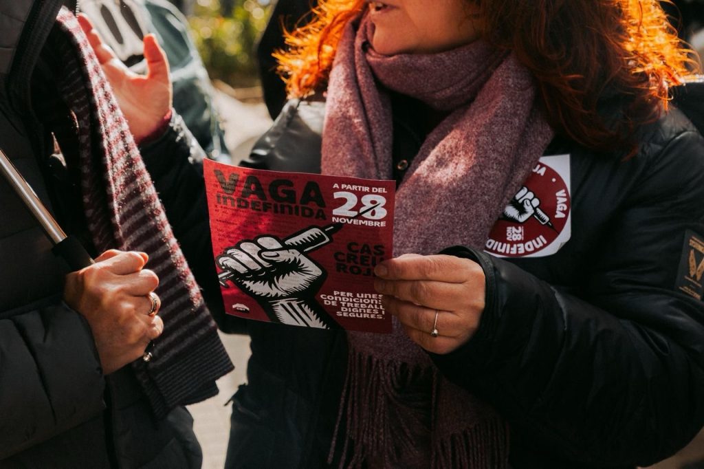 Laia: La nostra primera reivindicació era l’equiparació salarial amb els altres centres de Barcelona que fan la mateixa feina que nosaltres, però que pengen del conveni SISCAT, el conveni de sanitat pública-privada. El nostre conveni, en canvi, era el d’acció social, on hi ha una diferència salarial molt clara. També demanàvem un plus salarial per les incidències que es donen al nostre centre de treball, per les complexitats de l’àmbit en què treballem. I, en tercer lloc, demanàvem tant un acompanyament psicològic com jurídic per part de l’empresa davant d’aquestes incidències que es podien donar. No havíem rebut mai cap acompanyament per part de l’empresa. Per tant, demanàvem un protocol elaborat que reconegués també això.