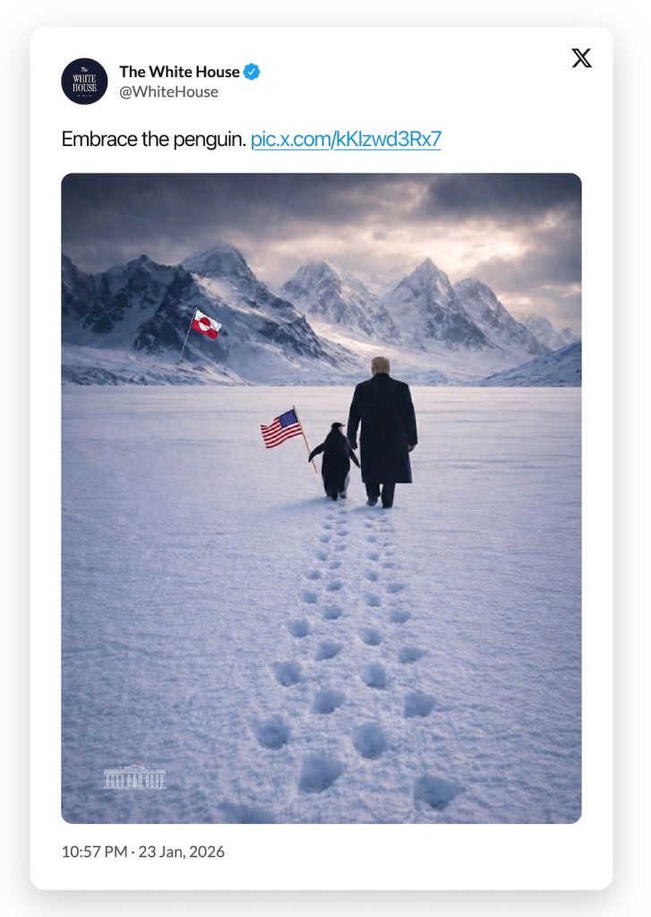 Ahir divendres 23 de gener de 2026, la Casa Blanca compartia una desconcertant publicació a les seves xarxes socials. La piulada conté el missatge «Segueix el pingüí» i va acompanyada d’un fotomuntatge fet amb IA de Donald Trump i un pingüí, amb una bandera dels EUA, caminant sobre la neu direcció cap a unes muntanyes on hi ha una bandera de Groenlàndia.