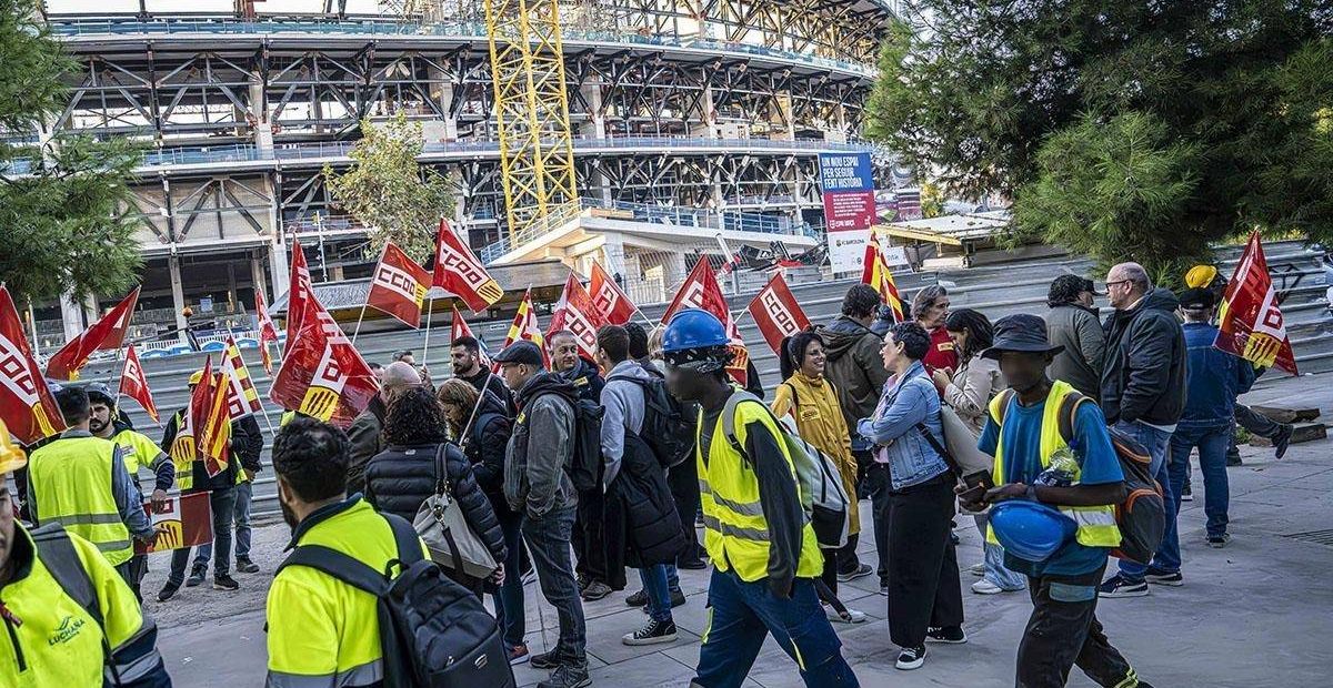 Desenes de treballadors de la remodelació del Spotify Camp Nou s’han concentrat aquest dimarts davant de l’estadi per denunciar acomiadaments, irregularitats laborals i precarietat extrema a les obres dirigides per la constructora Limak Construction. CCOO i diverses entitats reclamen a la Delegació del Govern que activi la regularització extraordinària per col·laboració amb les autoritats laborals per protegir els operaris acomiadats.